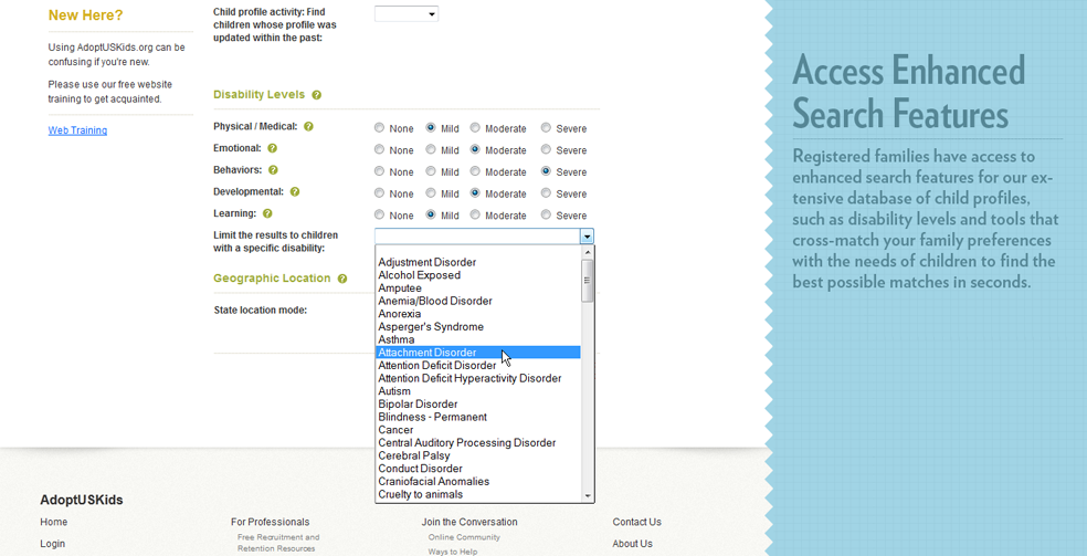 - Enhanced search features for our extensive database of child profiles that allow you to find hundreds of possible matches in seconds based on child preferences that match your family’s